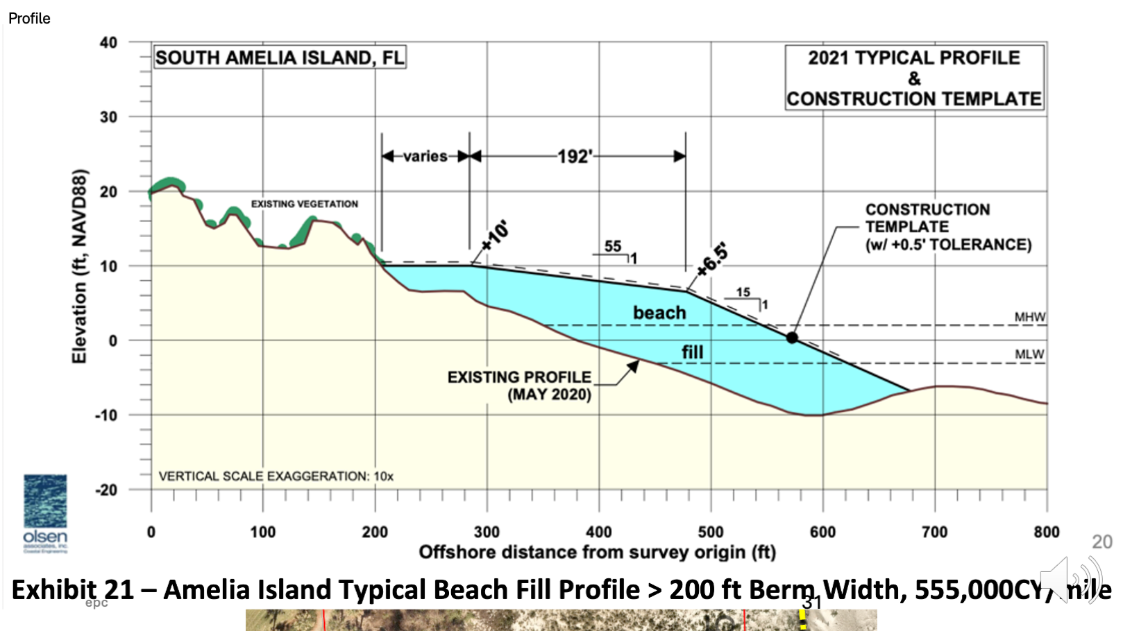 Heavy coastal storms ravage all the beach along the east coast. Over the past 50 years more than 100 locations have effectively used beach nourishment to periodically recycle the sand that has been swept away, using off-shore ships and pumps to return the sand. The South Amelia Island Shoreline Stabilization Association has the lead for us and is in a cycle of replenishment about every ten years. Below is a sample profile from the last project.