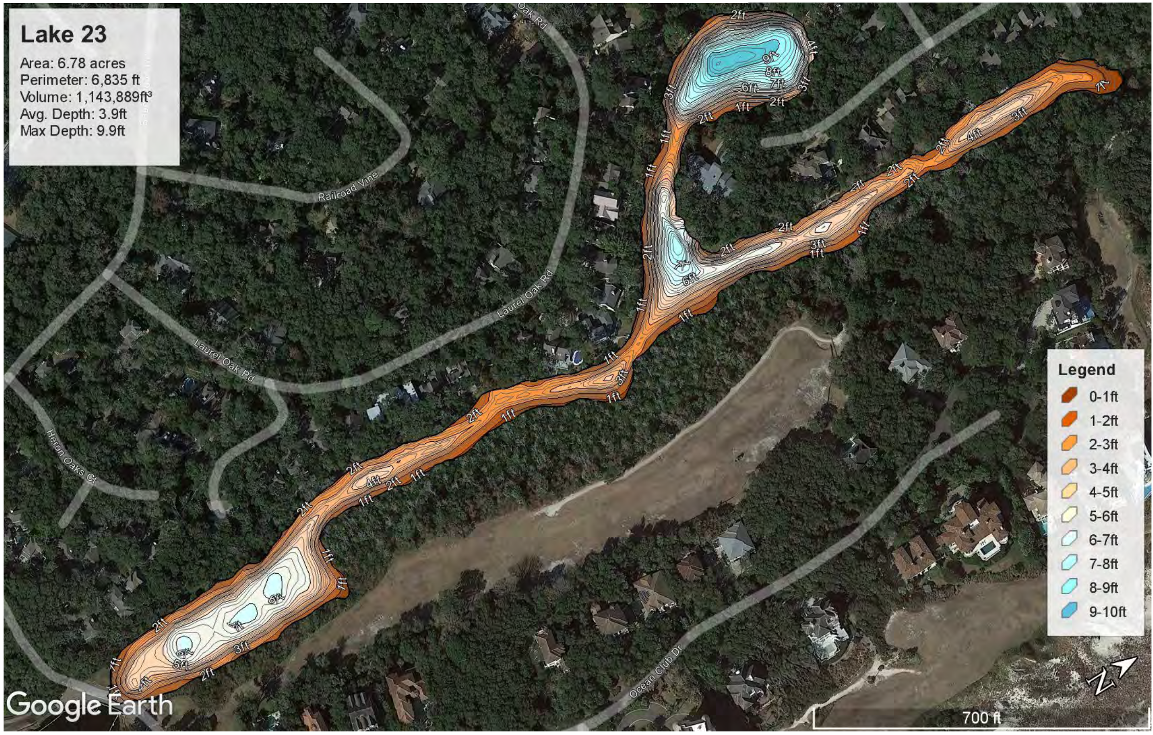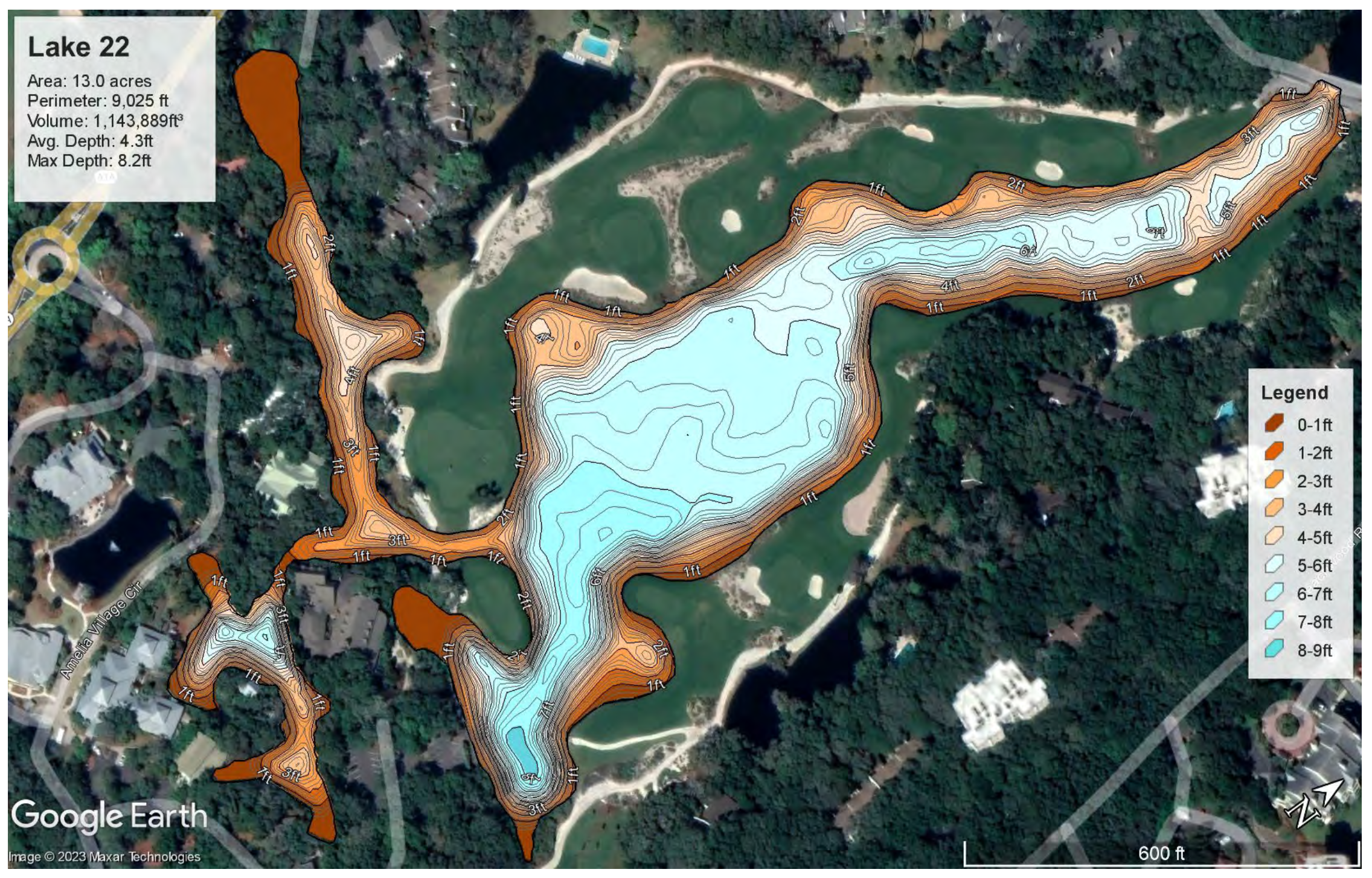 The southern portion of Red Maple Lake is about 13 acres, surrounded by portions of OMNI’s “Little Sandy” golf course. Below is a graphic of the lake’s boundaries owned by AIPCA, then a panoramic photo taken from the south end looking north and finally the lake depth profiles taken using sonar.