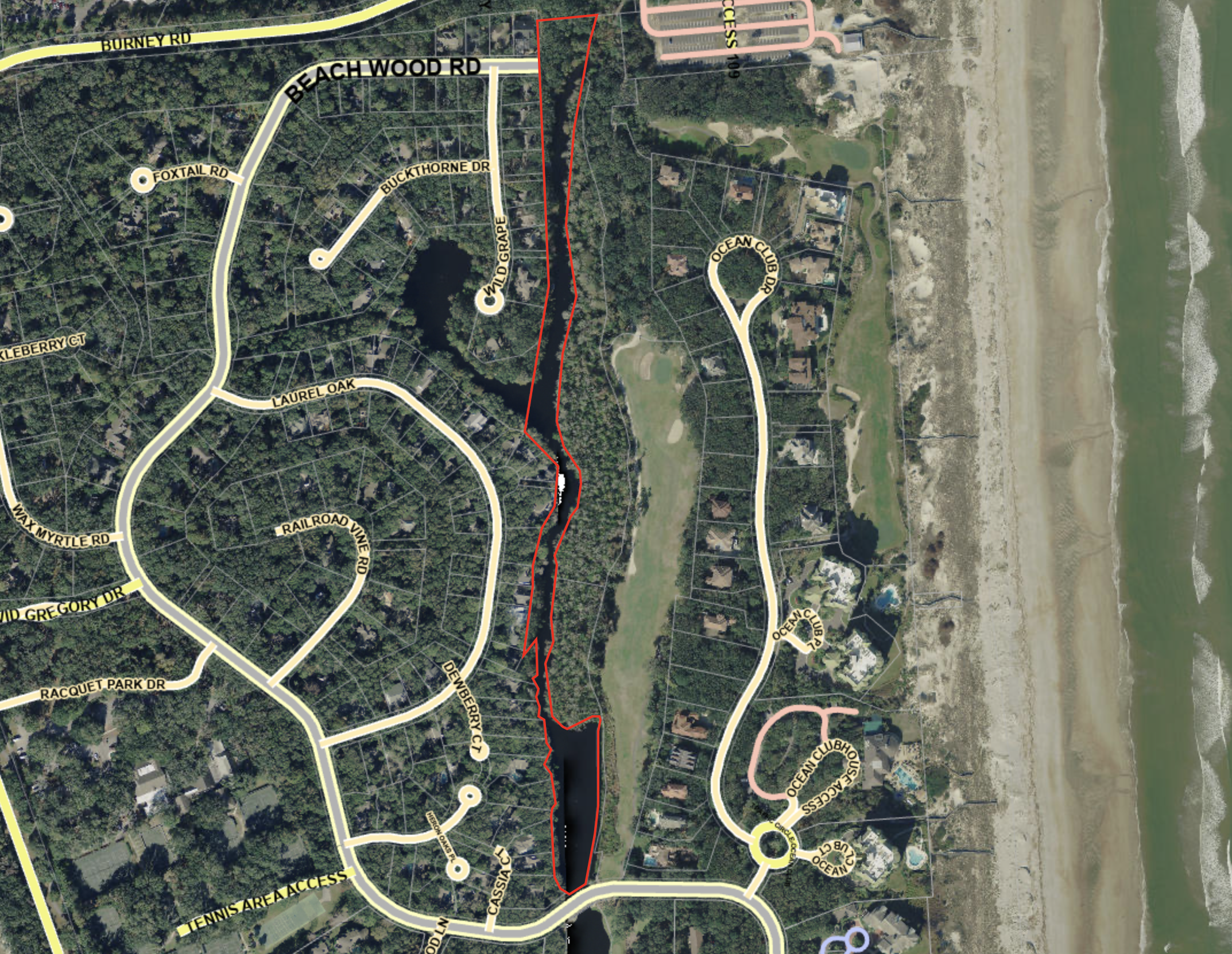 Below is the outline of the northern portion of Red Maple Lake overlayed on an aerial photograph. Midway along the lake is a branch to the west known as Wild Grape Lake. Depth profiles are shown below.