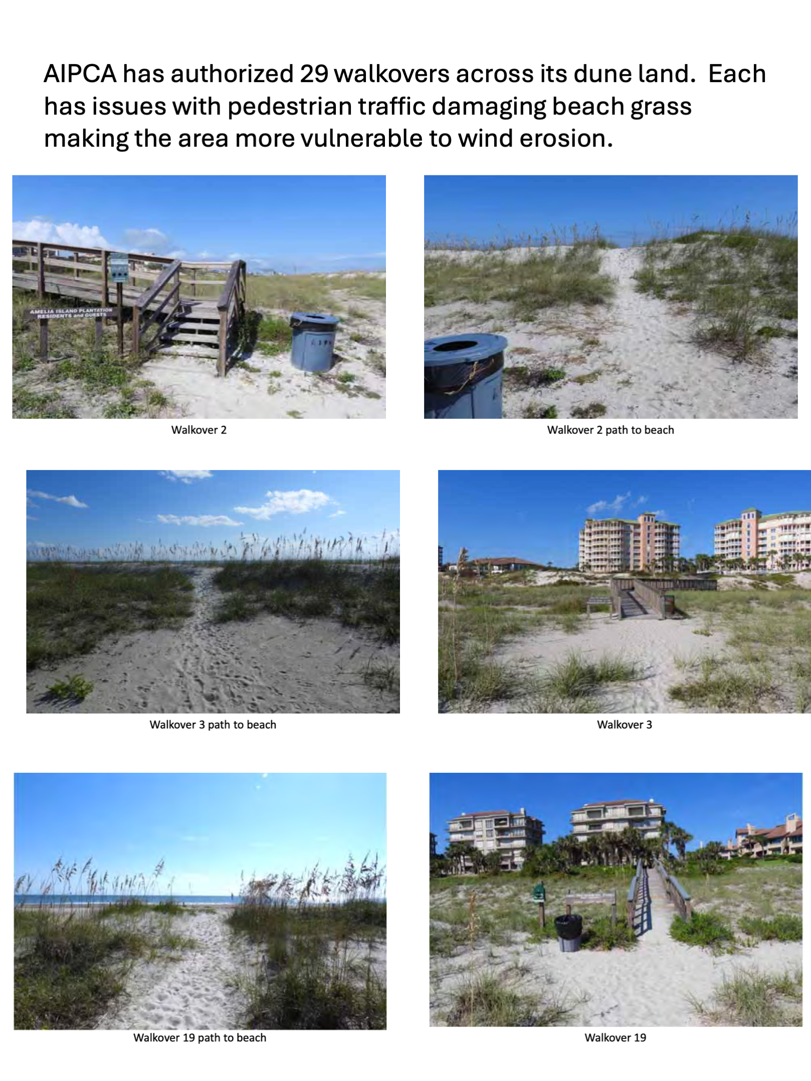 AIPCA owns two miles of oceanfront dune land verging about 250 feet wide. We own six walkovers that we maintain for the benefit of all property owners. There are 23 others used by private home and condo associations that have been granted easements by AIPCA. The issue for all of these is that pedestrian traffic can destroy native beach grasses that prevent the soil from being blown away. Our objective is to maintain healthy native beach grass ground-cover to minimize wind erosion. In worst case situations sand fence is used on a temporary basis until the natural grass cover can be restored.